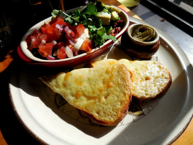 served with avocado, tomato salsa, sour cream and cheesy toast and optional jalapeños
